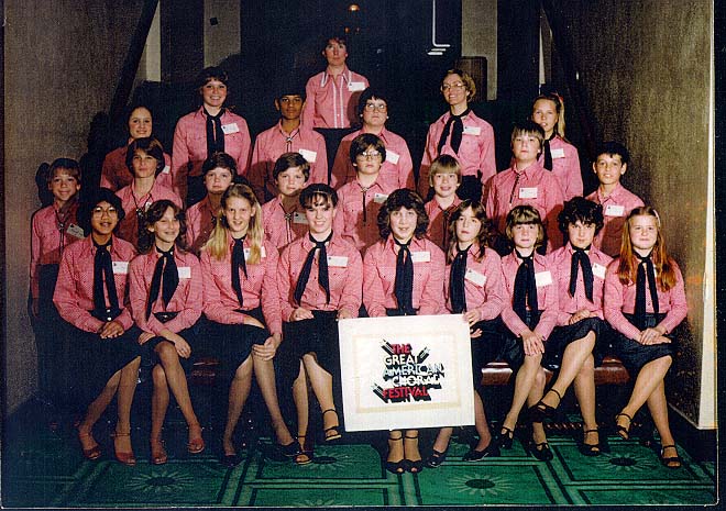 This picture was taken at the Great American Choral Festival at the old Keil Auditorium in the Spring of 1982. There are three adults in the picture. On the left side (second from the left in the back row) is Assistant Director Sue Pocklington. In the center back is Accompanist Jan Werner. Second from the right in the back row is Founder and Music Director, Diane Finley. I won't list everyone in the picture, but Tisha (Sparfeld) Haschart is third from the left in the front row and I am all the way to the left of the second row. Don't you just love these uniforms?