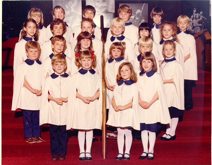 Here is a group picture of Training Choir (later renamed Children's Choir) from the Spring of 1983. This was Mrs. Sparfeld's first year as Music Director. We rehearsed at the Westport Playhouse and this picture was taken in the lobby. Some long-time choir members pictured here are: Alicia Norman (second from the left in the front row) and Jeff Stringer (second from the left in the back row). I'm guessing Bryon Davis is on the far right of the back row. These robes were our infamous reversible robes. Cheryl Martinez is second from the right of the third row. They were white and blue on this side, with red and white collars on the other...they were very heavy!