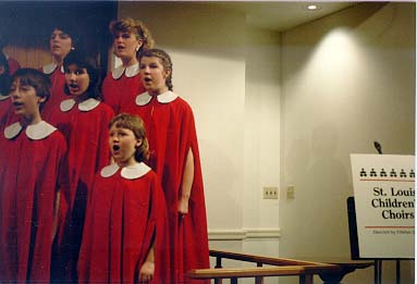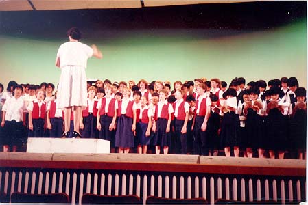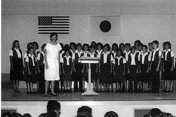 In concert in Suwa, Japan (St. Louis' sister city). We not only performed several Japanese folk songs, but arranged to sing American folk songs with Japanese children (as seen here).